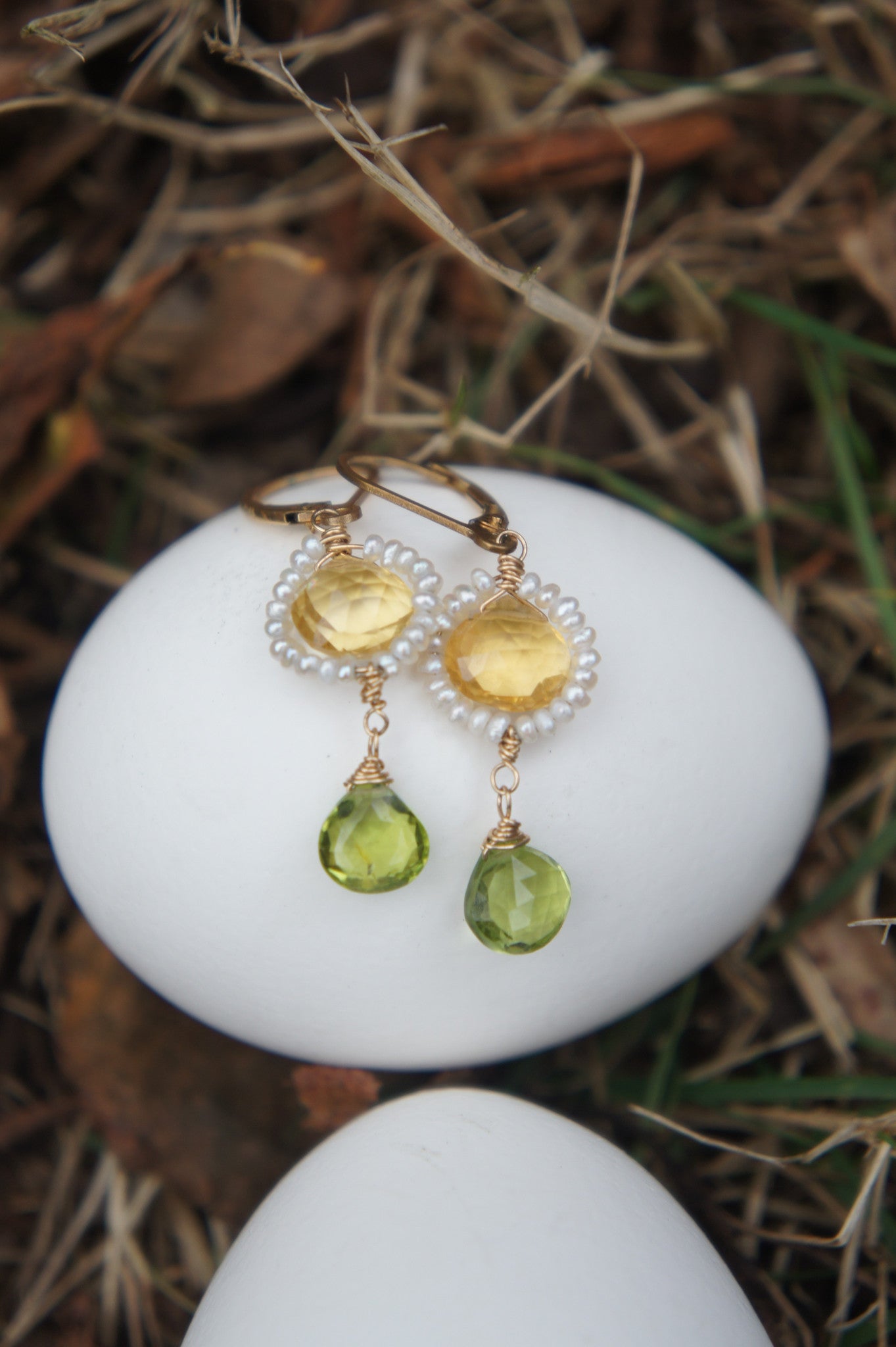 Citrines framed by tiny seed pearls are paired with peridot drops and dangle from 14 kt goldfill handmade earwires.